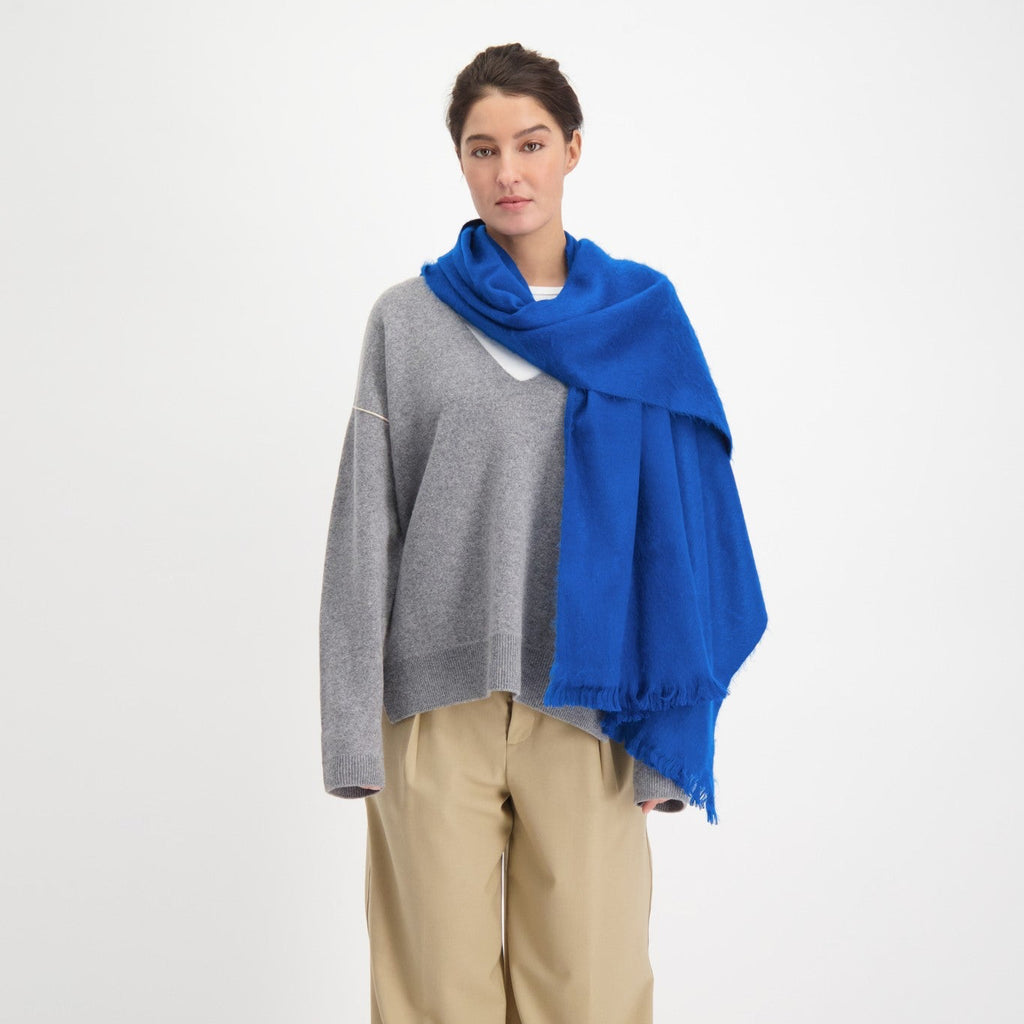 Cette écharpe apporte une touche vive et élégante à vos tenues d’hiver. J’aime le bleu intense qui se marie parfaitement avec des manteaux sombres ou des tons neutres, tout en vous enveloppant de douceur.