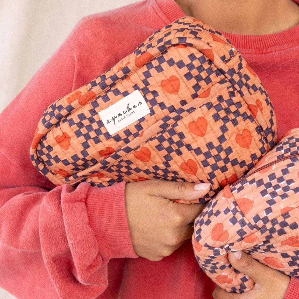 Découvrez la trousse Rahana en imprimé Amor Rust, parée de jolis cœurs dans des tons chaleureux et profonds. Compacte et pratique, elle est idéale pour ranger maquillage, petits soins, accessoires ou trésors personnels. Facile à transporter, elle se glisse dans tous les sacs et accompagne vos journées avec une touche de tendresse et d’élégance.Détails