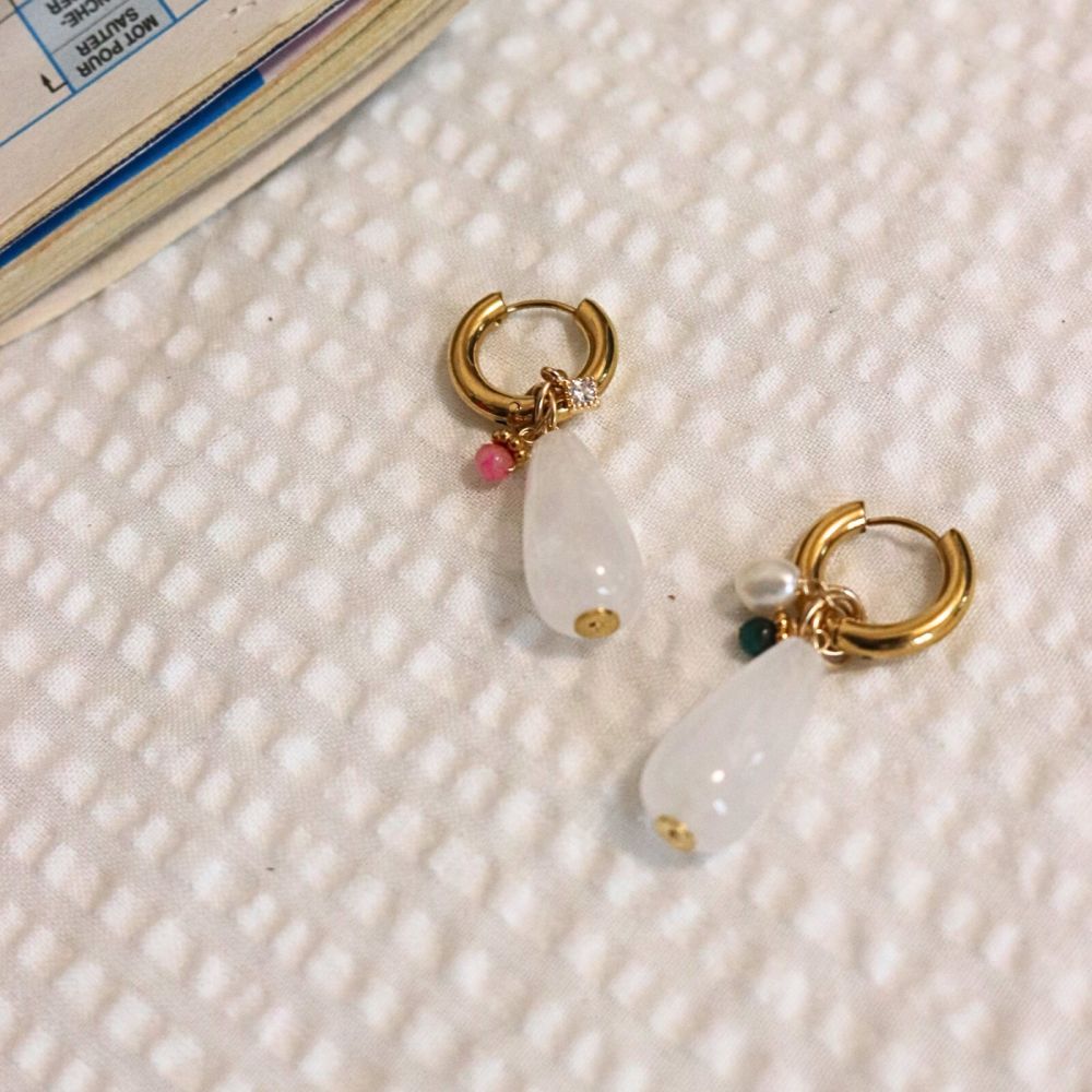 Les boucles d’oreilles Kenza allient élégance et raffinement. Leur design fin et travaillé met en valeur des pierres naturelles et des perles délicates, apportant une touche poétique et sophistiquée à vos tenues, du quotidien aux occasions spéciales.