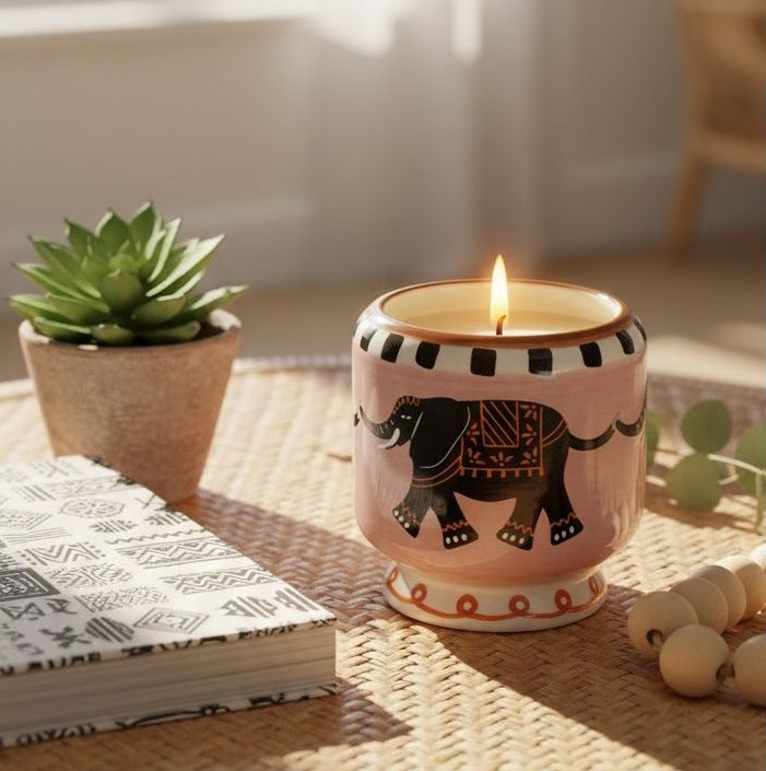 J’adore cette bougie pour son parfum doux et chaleureux de tabac vanille qui invite à la relaxation. Son pot rose peint à la main, orné d’un éléphant, peut être conservé comme objet déco, pour vos plantes ou pour y ranger de petits trésors.